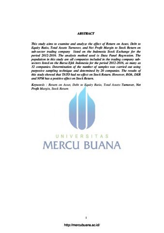 This study aims to examine and analyze the effect of Return on Asset, Debt to Equity Ratio, Total Assets Turnover, and Net Profit Margin to Stock Return on sub-sector trading company listed on the Indonesia Stock Exchange for the period 2012-2016. The analysis method used is Data Panel Regression. The population in this study are all companies included in the trading company subsectors listed on the Bursa Efek Indonesia for the period 2012-2016, as many as 32 companies. Determination of the number of samples was carried out using purposive sampling technique and determined by 20 companies. The results of this study showed that TATO had no effect on Stock Return. However, ROA, DER and NPM has a positive effect on Stock Return. Keywords : Return on Asset, Debt to Equity Ratio, Total Assets Turnover, Net Profit Margin, Stock Return Tujuan Penelitian ini untuk menganalisis pengaruh Return on Asset, Debt to Equity Ratio, Total Asset Turnover dan Net Profit Margin terhadap return saham pada perusahaan sub sektor perdagangan besar yang terdaftar di Bursa Efek Indonesia periode 2012 – 2016. Metode analisis yang digunakan adalah metode regresi data panel. Populasi dalam penelitian ini adalah seluruh perusahaan yang termasuk dalam sub sektor perdagangan besar yang terdaftar di BEI periode 2012-2016 sebanyak 32 perusahaan. Penentuan jumlah sampel dilakukan menggunakan teknik purposive sampling dan ditetapkan sebanyak 20 perusahaan. Hasil penelitian menunjukkan bahwa TATO tidak berpengaruh terhadap return saham. Namun, ROA, DER dan NPM berpengaruh signifikan positif terhadap return saham. Kata Kunci : Return on Asset, Debt to Equity Ratio, Total Assets Turnover, Net Profit Margin, Return Saham