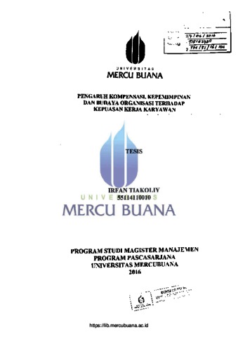 TIAKOLIY, IRFAN (2016) PENGARUH KOMPENSASI, KEPEMIMPINANDAN BUDAYA ORGANISASI TERHADAP KEPUASAN KERJA KARYAWAN. S2 thesis, Universitas Mercu Buana Jakarta.