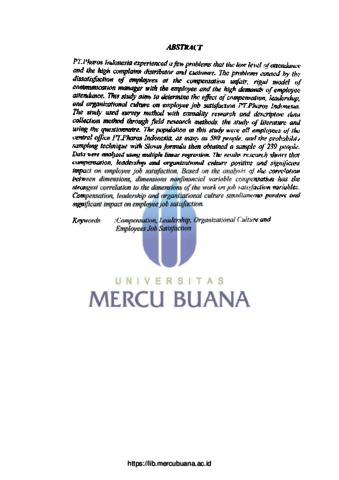 PT.Pharos Indonesia mengalami beberapa permasalahan yaitu tingkat kehadirar karyawan rendah serta tingginya komplenan distributor dan customer. Permasalahar tersebut disebabkan oleh adanya ketidak puasan kerja karyawan pada pemberian kompensasi yang tidak adil, model komunikasi manager yang kaku terhadap bawahar dan tingginya tuntutan kehadiran karyawan. Penelitian ini bertujuan mengetahui pengarul kompensasi, kepemimpinan, dan budaya organisasi terhadap kepuasan kerja karyawan PT.Pharos Indonesia. Penelitian menggunakan metode survey dengan penelitian kausalitas dan deskriftif dengan metode pengumpulan data melalui metode riset lapangan, studi kepustakaan dan menggunakan instrumen kuesioner. Populasi dalam penelitian in adalah seluruh karyawan kantor pusat PT.Pharos Indonesia, sebanyak 589 orang, teknik pengambilan sampel probabilitas dengan rumus Slovin di peroleh sampel sebanyak 239 orang. Analisa data menggunakan regresi linier berganda. Hasil penelitian menunjukkan bahwa kompensasi, kepemimpinan dan budaya organisasi berpengaruh positif dan signifikan terhadap kepuasan kerja karyawan. Berdasarkan analisis korelasi antar dimensi, dimensi non finansial pada variabel kompensasi memiliki korelasi paling kuat terhadap dimensi pekerjaan pada variabel kepuasan kerja. Kompensasi, kepemimpinan dan budaya organisasi secara simultan berpengaruh positif dan signifikan terhadap kepuasan kerja karyawan. Kata Kunci Kompensasi, Kepemimpinan, Budaya Organisasi dan Kepuasan Kerja Karyawan