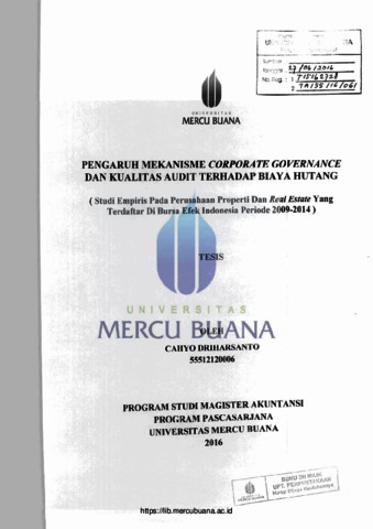 DRIHARSANTO, CAHYO (2016) PENGARUH MEKANISME CORPORATE GOVERNANCE DAN KUALITAS AUDIT TERHADAP BIAYA HUTANG (Studi Empiris Pada Perusahaan Properti Dan Real Estate Yang Terdaftar Di Bursa Efek Indonesia Periode 2009-2014). S2 thesis, Universitas Mercu Buana Jakarta.