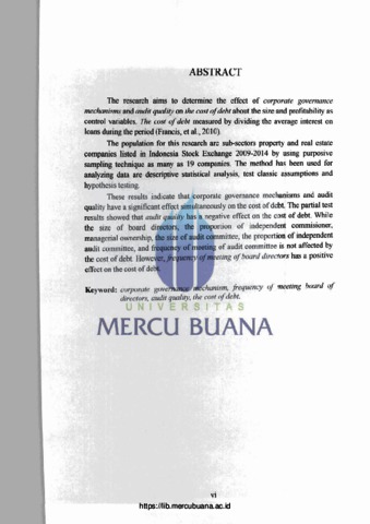 Penelitian ini bertujuan untuk menguji pengaruh dari mekanisme corporate governance dan kualitas audit terhadap biaya hutang dengan ukuran perusahaan dan profitabilitas sebagai variabel kontrol. Biaya hutang diukur dengan membagi beban bunga atas rata-rata pinjaman berbunga dalam satu periode (Francis, et al., 2010). Populasi penelitian ini adalah perusahaan properti dan real estate yang terdaftar di Bursa Efek Indonesia periode 2009-2014 dengan menggunakan teknik purposive sampling sebanyak 19 perusahaan. Metode analisis data menggunakan analisis statistik deskriptif, uji asumsi klasik dan pengujian hipotesis. Hasil penelitian ini menunjukkan bahwa mekanisme corporate governance dan kualitas audit berpengaruh signifikan secara simultan terhadap biaya hutang Hasil pengujian parsial menunjukkan bahwa kualitas audit berpengaruh negatif terhadap biaya hutang. Akan tetapi, ukuran dewan direksi, proporsi komisaris independen, kepemilikan manajerial, ukuran komite audit, dan proporsi komite audit independen tidak berpengaruh signifikan terhadap biaya hutang. Sementara, frekuensi pertemuan dewan direksi berpengaruh positif terhadap biaya hutang. Kata Kunci: mekanisme corporate governance, frekuensi pertemuan dewan direksi, kualitas audit, biaya hutang