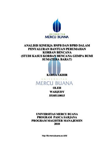 WAHJUDY, WAHJUDY (2010) ANALISIS KINERJA BNPB DAN BPBD DALAM PENYALURAN BANTUAN PERUMAHAN KORBAN BENCANA (STUDI KASUS KORBAN BENCANA GEMPA BUMI SUMATERA BARAT). S2 thesis, Universitas Mercu Buana Jakarta-Menteng.