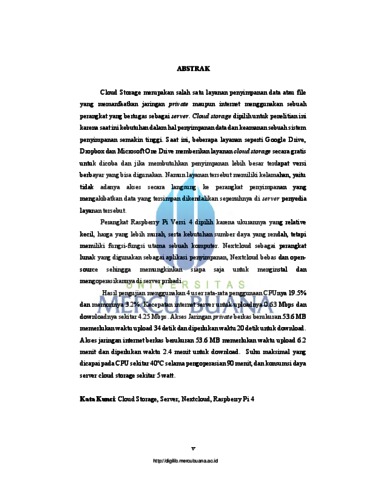 ABSTRAK Cloud Storage merupakan salah satu layanan penyimpanan data atau file yang memanfaatkan jaringan private maupun internet menggunakan sebuah perangkat yang bertugas sebagai server. Cloud storage dipilih untuk penelitian ini karena saat ini kebutuhan dalam hal penyimpanan data dan keamanan sebuah sistem penyimpanan semakin tinggi. Saat ini, beberapa layanan seperti Google Drive, Dropbox dan Microsoft One Drive memberikan layanan cloud storage secara gratis untuk dicoba dan jika membutuhkan penyimpanan lebih besar terdapat versi berbayar yang bisa digunakan. Namun layanan tersebut memiliki kelamahan, yaitu tidak adanya akses secara langsung ke perangkat penyimpanan yang mengakibatkan data yang tersimpan dikendalikan sepenuhnya di server penyedia layanan tersebut. Perangkat Raspberry Pi Versi 4 dipilih karena ukurannya yang relative kecil, harga yang lebih murah, serta kebutuhan sumber daya yang rendah, tetapi memiliki fungsi-fungsi utama sebuah komputer. Nextcloud sebagai perangkat lunak yang digunakan sebagai aplikasi penyimpanan, Nextcloud bebas dan opensource sehingga memungkinkan siapa saja untuk menginstal dan mengoperasikannya di server pribadi. Hasil pengujian menggunakan 4 user rata-rata penggunaan CPUnya 19.5% dan memorinya 3.2%. Kecepatan internet server untuk uploadnya 0.63 Mbps dan downloadnya sekitar 4.25 Mbps. Akses Jaringan private berkas berukuran 53.6 MB memerlukan waktu upload 34 detik dan diperlukan waktu 20 detik untuk download. Akses jaringan internet berkas berukuran 53.6 MB memerlukan waktu upload 6.2 menit dan diperlukan waktu 2.4 menit untuk download. Suhu maksimal yang dicapai pada CPU sekitar 40℃ selama pengoperasian 90 menit, dan konsumsi daya server cloud storage sekitar 5 watt. Kata Kunci: Cloud Storage, Server, Nextcloud, Raspberry Pi 4 ABSTRACT Cloud Storage is a data or file storage service that utilizes private or internet networks using a device that serves as a server. Cloud storage was chosen for this research because the current needs in terms of data storage and security of a storage system are increasingly high. At present, several services such as Google Drive, Dropbox and Microsoft One Drive provide free cloud storage services to try and if you require more storage there is a paid version that can be used. However, these services have weaknesses, there is no direct access to the storage device which causes the stored data to be fully controlled on the server of the service provider. Raspberry Pi 4 was chosen because of its relatively small size, lower price, and low resource requirements, but it has the main functions of a computer. Nextcloud as a software used as a storage application, Nextcloud is free and opensource so it allows anyone to install and operate it on a private server. The test results using 4 users an average of 19.5% CPU usage and 3.2% memory. Internet server speed for upload is 0.63 Mbps and the download is around 4.25 Mbps. Access private network with a file size of 53.6MB requires 34 seconds to upload and 20 seconds to download. Access internet network with a file size of 53.6MB requires a upload time of 6.2 minutes and a 2.4 minute time to download. The maximum temperature reached on the CPU is around 40 ℃ during 90 minutes operation, and the cloud storage server power consumption is around 5 watts. Keywords: Cloud Storage, Server, Nextcloud, Raspberry Pi 4