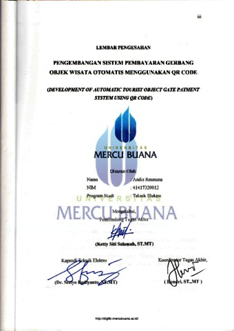 RESMANA, ANDIS (2019) PENGEMBANGAN SISTEM PEMBAYARAN GERBANG OBJEK WISATA OTOMATIS MENGGUNAKAN QR CODE. S1 thesis, Universitas Mercu Buana Bekasi.