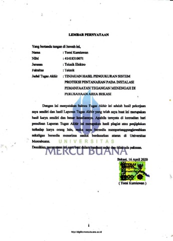 ABSTRAK Sebagaimana diketahui, kehidupan modern seperti saat ini memiliki ketergantungan yang sangat tinggi terhadap ketersediaan energi listrik. Oleh karena itulah, permintaan terhadap energi listrik semakin hari akan semakin meningkat. Namun demikian, perlu disadari bahwa selain bermanfaat bagi kehidupan, tenaga listrik juga memiliki potensi bahaya terhadap keselamatan apabila salah dalam penanganan dan pemanfaatannya. Masih sering terjadi kebakaran yang diduga diakibatkan oleh arus bocor atau arus hubung pendek listrik atau kecelakaan akibat terkena/tersentuh arus listrik yang menyebabkan luka bahkan korban jiwa. Dalam upaya mewujudkan kondisi andal dan aman bagi instalasi, aman dari bahaya terhadap manusia dan makhluk hidup lain, serta ramah bagi lingkungan, diperlukan sistem kelistrikan dengan sistem pengaman (protection system) yang sangat baik dan benar yang memenuhi kaidah-kaidah instalasi tenaga listrik sesuai dengan ketentuan. Salah satu sistem pengaman yang dapat digunakan untuk mencegah halhal yang tidak diinginkan adalah dengan pemasangan sistem proteksi pentanahan pada seluruh peralatan yang bertegangan. Setelah dilakukan pemasangan sistem proteksi pentanahan dilakukan pengukuran tahanan pentanahan untuk mengetahui apakah nilai pengukuran tahanan pentanahan sudah sesuai standar atau belum. Pada Tugas Akhir ini, telah dilakukan pengukuran tahanan tanah, tahanan jenis tanah, dan tahanan pentanahan pada body trafo, netral trafo, dan body kubikel instalasi pemanfaatan tegangan menengah di perusahaan area bekasi. Pengukuran ini dilakukan dengan menggunakan alat ukur Digital Earth Tester dan Soil Resistivity Tester. Setelah dilakukan pengukuran tahanan tanah pada 3 titik (body trafo, netral trafo, dan body kubikel) didapatkan hasil 37 Ω, 37 Ω, 36 Ω di PT. Focus Color Indonesia, 39 Ω, 39 Ω, 35 Ω di PT. Misumi Indonesia, 36 Ω, 35 Ω, 37 Ω di PT. Indonesia Steel Tube Works, 37 Ω, 37 Ω, 36 Ω di PT. RBFood Manufaktur Indonesia, dan 35 Ω, 35 Ω, 38 Ω di PT. Trimitra Indoplast Mandiri. Dengan menggunakan persamaan