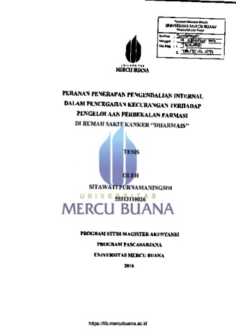 PURNAMANINGSIH, SITAWATI (2016) PERANAN PENERAPAN PENGENDALIAN INTERNAL DALAM PENCEGAHAN KECURANGAN TERHADAP PENGELOLAAN PERBEKALAN FARMASI DI RUMAH SAKIT KANKER DHARMAIS. S2 thesis, Universitas Mercu Buana Jakarta.