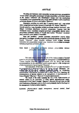 Penelitian ini bertujuan untuk mengetahui peranan penerapan pengendalian internal dalam pencegahan kecurangan terhadap pengelolaan perbekalan farmasi di RS. Kanker "Dharmais" jika dibandingkan dengan teori dan memberikan rekomendasi sistem pengendalian yang sesuai untuk diterapkan pada pengelolaan perbekalan farmasi di Rumah sakit Kanker "Dharmais". Responden penelitian ini terdiri dari 13 pegawai negeri sipil yang terkait dalam pengelolaan perbekalan farmasi di lingkungan RS. Kanker "Dharmais". Metode penelitian yang digunakan adalah pendekatan kualitatif deskriptif, yaitu dengan melakukan penyebaran kuesioner, pengamatan, berperan serta dan wawancara secara mendalam mengenai penerapan pengendalian internal dalam pengelolaan perbekalan farmasi di Rumah Sakit Kanker "Dharmais". Kuesioner yang memenuhi syarat adalah 13 responden. Hasil dari penelitian peranan penerapan pengendalian internal dalam pencegahan kecurangan terhadap pengelolaan perbekalan farmasi di Rumah Sakit Kanker "Dharmais" cukup memadai walaupun masih terdapat beberapa kelemahan dari pengendalian internal yang berpotensi menyebabkan kecurangan terhadap pengelolaan perbekalan farmasi.