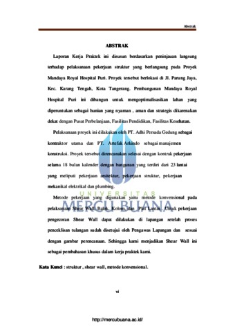 Laporan Kerja Praktek ini disusun berdasarkan peninjauan langsung terhadap pelaksanaan pekerjaan struktur yang berlangsung pada Proyek Mandaya Royal Hospital Puri. Proyek tersebut berlokasi di Jl. Parung Jaya, Kec. Karang Tengah, Kota Tangerang. Pembangunan Mandaya Royal Hospital Puri ini dibangun untuk mengoptimalisasikan lahan yang diperuntukan sebagai hunian yang nyaman , aman dan strategis dikarenakan dekat dengan Pusat Perbelanjaan, Fasilitas Pendidikan, Fasilitas Kesehatan. Pelaksanaan proyek ini dilakukan oleh PT. Adhi Persada Gedung sebagai kontraktor utama dan PT. Artefak Arkindo sebagai manajemen konstruksi. Proyek tersebut direncanakan selesai dengan kontrak pekerjaan selama 18 bulan kalender dengan bangunan yang terdiri dari 23 lantai yang meliputi pekerjaan arsitektur, pekerjaan struktur, pekerjaan mekanikal elektrikal dan plumbing. Metode pekerjaan yang digunakan yaitu metode konvensional pada pelaksanaan Shear Wall, Balok, Kolom, dan Plat Lantai . Untuk pekerjaan pengecoran Shear Wall dapat dilakukan di lapangan setelah proses penceklisan tulangan sudah disetujui oleh Pengawas Lapangan dan sesuai dengan gambar perencanaan. Sehingga kami menjadikan Shear Wall ini sebagai pembahasan khusus dalam kerja praktek kami. Kata Kunci : struktur , shear wall, metode konvensional.