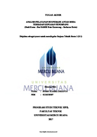 RAHMA DHIANTO, BOBBY (2018) ANALISIS PELAYANAN BUS PEMADU ANTAR MODA TERHADAP KEPUASAN PENUMPANG (Studi Kasus : Bus DAMRI Rute Karawang – Soekarno Hatta). S1 thesis, Universitas Mercu Buana Bekasi.