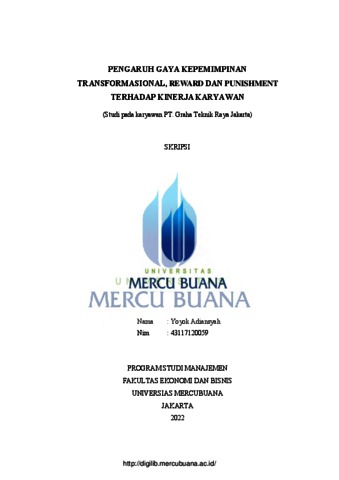 ARDIANSYAH, YOYOK (2022) PENGARUH GAYA KEPEMIMPINAN TRANSFORMASIONAL, REWARD DAN PUNISHMENT TERHADAP KINERJA KARYAWAN (Studi pada karyawan PT. Graha Teknik Raya Jakarta). S1 thesis, Universitas Mercu Buana Jakarta.