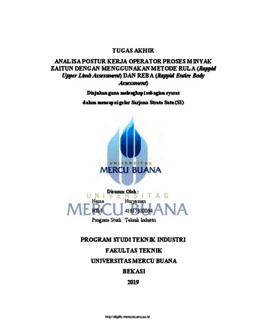 NURYAMAN, (2019) ANALISA POSTUR KERJA OPERATOR PROSES MINYAK ZAITUN DENGAN MENGGUNAKAN METODE RULA (Rappid Upper Limb Assessment) DAN REBA (Rappid Entire Body Assessment). S1 thesis, Universitas Mercu Buana Bekasi.