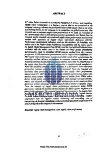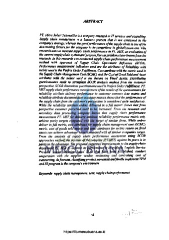 PT. Mitra Solusi Telematika merupakan perusahaan yang bergerak dibidang jasa dan konsultan IT. Supply chain management merupakan proses bisnis yang tidak terdapat dalam strategi perusahaan, padahal kinerja supply chain yang baik merupakan salah satu faktor penentu bagi perusahaan agar dapat bersaing diera globalisasi sekarang ini. Penelitian ini bertujuan untuk mengukur kinerja supply chain di PT. MST, melakukan evaluasi terhadap sistem supply chain saat ini dan memberikan usulan perbaikan terhadap masalah yang kemudian diketahui dari hasil penelitian. Dalam penelitian ini dilakukan pengukuran kinerja supply chain dengan pendekatan metode Supply Chain Operations Reference (SCOR). Indikator pengukuran kinerja yang dipakai adalah atribut Reliability dengan metrik yang dipakai adalah Perfect Order Fulfillment, atribut Cost dengan metrik yang dipakai adalah Supply Chain Management Cost (SCMC) dan Cost of Good Sold serta atribut Asset dengan metrik yang digunakan adalah Return on Fixed Assets. Penyebaran kuesioner dilakukan untuk memperkuat analisa metode SCOR dari perspektif pelanggan. Dimensi SCOR kuesioner yang digunakan adalah Perfect Order Fulfillment. Pengukuran kinerja supply chain PT.MST dari hasil kuesioner untuk atribut reliability matrik delivery performance to customer commit date dan atribut reliability metrik documentation accuracy menunjukkan bahwa kinerja supply chain dari perspektif pelanggan dirasa cukup memuaskan, sedangkan atribut reliability matrik order delivered in full menunjukkan bahwa dari perspektif pelanggan metrik ini dirasakan perlu ditingkatkan kembali. Dari hasil penelitian dan pengolahan data sekunder perusahaan diketahui bahwa pengukuran kinerja supply chain PT. MST untuk atribut reliability metrik delivery performance hanya mencapai target parity dibandingkan dengan target dari perusahaaan sejenis. Sedangkan metrik order deliver in full, atribut cost untuk metrik supply chain management cost (SCMC), metrik cost of goods sold dan atribut asser untuk metrik return on fixed asset dapat mencapai target advantage dibandingkan dengan target dari perusahaan sejenis. Dari hasil analisa penilaian kinerja supply chain menggunakan pendekatan metoda SCOR ini, posisi perusahaan (PT.MST) terhadap perusahaan sejenis adalah di parity menuju advantage. Usulan perbaikan yang disarankan kepada departemen supply chain PT. MST dalam meningkatkan kinerjanya adalah melakukan evaluasi pemilihan vendor Logistic Service Provider berdasarkan SLA yang telah ditetapkan, melakukan kerjasama dengan vendor pemasok perangkat, melakukan evaluasi dan mengkontrol biaya outsource, melakukan forecast, melakukan pengklasifikasian product movement serta melaksanakan program TPM dan 5S dilingkungan internal perusahaan.