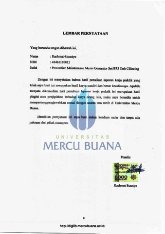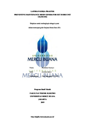 SUSETYO, RACHMAT (2019) PREVENTIVE MAINTENANCE MESIN GENERATOR SET DI BRI UNIT CILINCING. S1 thesis, Universitas Mercu Buana Jakarta.