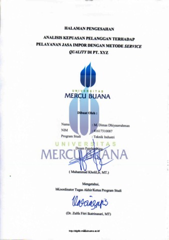 DHYAURRAHMAN, M.DIMAS (2019) ANALISIS KEPUASAN PELANGGAN TERHADAP PELAYANAN JASA IMPOR DENGAN METODE SERVICE QUALITY DI PT. XYZ. S1 thesis, Universitas Mercu Buana Bekasi.