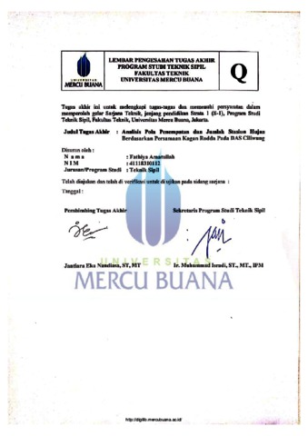 Analisis Pola Penempatan dan Jumlah Stasiun Hujan Berdasarkan Persamaan Kagan Rodda Pada DAS Ciliwung, Fathiya Amatullah, 41118310112, Jantiara Eka Nandiasa, S.T, M.T, 2020. Keakuratan data hidrologi dipengaruhi jumlah stasiun hujan pada suatu daerah aliran sungai, kerapatan dan pola penyebarannya serta ketelitian dalam pencatatan data itu sendiri. Adapun sistem jaringan kerja alat penakar hujan harus direncanakan sesuai dengan keperluan pemanfaatan data curah hujan yang akan dikumpulkan. Penempatan stasiun hujan pada suatu Daerah Aliran Sungai (DAS) dapat dicari dengan menggunakan persamaan metode Kagan Rodda. DAS Ciliwung yang merupakan DAS pada wilayah yang telah berkembang dengan tingkat kepadatan penduduk yang tinggi yang jumlah alat penakar hujan yang diperlukan banyak, saat ini terdapat 7 Stasiun Hujan. Setelah dicari analisis pola penempatan dan jumlah stasiun hujan dengan metode Kagan Rodda pada DAS Ciliwung didapatkan rekomendasi stasiun sejumlah 4 stasiun, sehingga jumlah stasiun pada DAS Ciliwung menjadi 11 stasiun, dan pola penempatan dengan segitiga Kagan Rodda didapat panjang sisi segitiga sama dengan jarak antar stasiun hujan yaitu L=7.947km. Kata Kunci : Jarak, Stasiun Hujan, DAS Ciliwung, Kagan Rodda. http://digilib.mercubuana.ac.id/ v ABSTRACT Analysis of Placement Patterns and Number of Rain Stations Based on Kagan Rodda's Equation in Ciliwung Watershed, Fathiya Amatullah, 41118310112, Jantiara Eka Nandiasa, S.T, M.T, 2020 The accuracy of hydrological data is influenced by the number of rain stations in a watershed, the density and distribution patterns as well as the accuracy in recording the data itself. The rain gauge network system must be planned in accordance with the needs of the rainfall data to be collected. The placement of a rain station in a watershed (DAS) can be found using the Kagan Rodda method equation. The Ciliwung Watershed is a watershed in an area that has been developed with a high population density with a large number of rain gauges, currently there are 7 rain stations. After looking for the analysis of the placement pattern and the number of rain stations using the Kagan Rodda method in the Ciliwung watershed, it was found that 4 stations were recommended, so that the number of stations in the Ciliwung watershed became 11 stations, and the placement pattern with the Kagan Rodda triangle obtained that the side length of the triangle is the same as the distance between rain stations, namely L = 7.947km. Keywords : Length, Rain Station, Ciliwung watershed, Kagan Rodda.