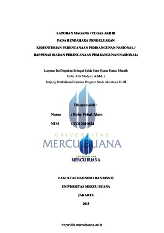 Alam, Boby Feisal (2015) LAPORAN MAGANG / TUGAS AKHIR PADA BENDAHARA PENGELUARAN KEMENTERIAN PERENCANAAN PEMBANGUNAN NASIONAL / BAPPENAS (BADAN PERENCANAAN PEMBANGUNAN NASIONAL. D3 thesis, Universitas Mercu Buana.