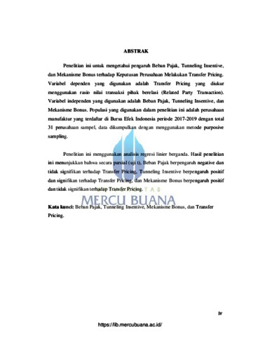 OKTAVIA, DINA (2022) PENGARUH BEBAN PAJAK, TUNNENLING INSENTIVE DAN MEKANISME BONUS TERHADAP KEPUTUSAN PERUSAHAAN MELAKUKAN TRANSFER PRICING PADA PERUSAHAAN MANUFAKTUR YANG TERDAFTAR DI BURSA EFEK INDONESIA. S1 thesis, Universitas Mercu Buana.