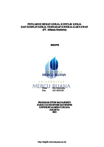 AMELLINDA, DEA (2022) PENGARUH BEBAN KERJA, KONFLIK KERJA DAN DISIPLIN KERJA TERHADAP KINERJA KARYAWAN (PT. Milenia Multivisi). S1 thesis, Universitas Mercu Buana Jakarta.