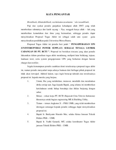 Pada Tugas Akhir ini penulis membahas tentang Pengoperasian UPS ( Uninterubtible Power Supply ) sebagai Sumber Tenaga Listrik Cadangan di PT. RCTI. UPS adalah suatu sistem yang dapat mengubah tegangan AC – DC – AC . Tahapan perubahan AC – DC melewati tiga langkah. Pada langkah pertama, input suplai tegangan AC diubah manjadi DC oleh rectifier utama. Langkah kedua, pengubah resonansi mengubah tegangan DC menjadi tegangan AC befrekuensi tinggi. Dan pada langkah ketiga rectifier mengubah tegangan AC berfrekuensi tinggi menjadi DC bertegangan tinggi. Sebuah baterai digunakan sebagai input suplai cadangan ketika input yang menuju rectifier mengalami gangguan. Semakin besar kapasitas baterai dalam sebuah UPS maka UPS tersebut (dengan beban yang sama besar ) akan mampu mensuplai tenaga lebih lama dari pada UPS dengan kapasitas yang lebih kecil. Hendaklah dalam pemilihan UPS harus di pertimbangkan dahulu terhadap beban yang akan dipakai, yaitu berapa lama beban tersebut akan di back up, hal tersebut dapat mengefesienkan pemakaian UPS baik dari sisi ekonomi dan kebutuhannya.