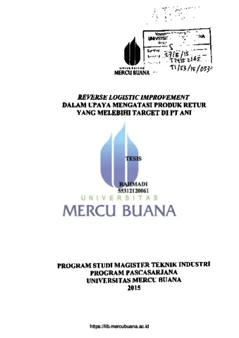 RAHMADI, RAHMADI (2015) REVERSE LOGISTIC IMPROVEMENT DALAM UPAYA MENGATASI PRODUK RETUR YANG MELEBIHI TARGET DI PT. ANI. S2 thesis, Universitas Mercu Buana Jakarta.