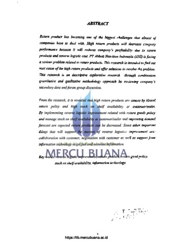 Produk retur merupakan tantangan terbesar yang dihadapi oleh hampir semua perusahaan baik manufaktur maupun jasa. Produk retur yang tinggi akan mempengaruhi kinerja perusahaan karena akan mengurangi keuntungan akibat produk retur maupun biaya reverse logistic yang menyertainya. PT Abbott Nutrition Indonesia (ANI) menghadapi permasalahan yang cukup serius berkaitan dengan tingginya produk retur yang terjadi. Penelitian ini dimaksudkan untuk mencari akar permasalahan penyebab terjadinya produk retur yang tinggi dan mendapatkan solusi untuk mengatasi permasalahan tersebut. Penelitian ini merupakan penelitian deskriptif exploratif dengan menggunakan metode pendekatan gabungan kuantitatif dan kualitatif melalui kajian data sekunder perusahaan dan forum diskusi kelompok. Dari hasil kajian yang dilakukan diperoleh bahwa produk retur yang terjadi akibat kebijakan produk retur yang longgar dan tingginya ketersediaan stok di customer/outlet. Dengan implementasi reverse logistic improvement yang berkaitan dengan perbaikan kebijakan produk retur dan menjaga ketersediaan stok di customer/outlet dan memperbaiki demand forecast diharapkan dapat menurunkan level produk retur perusahaan. Beberapa hal penting lainnya yang mempengaruhi keberhasilan reverse logistic improvement diantaranya; kolaborasi customer, negosiasi dengan customen serta penggunakan teknologi informasi untuk mendapatkan informasi yang cepat dan akurat.