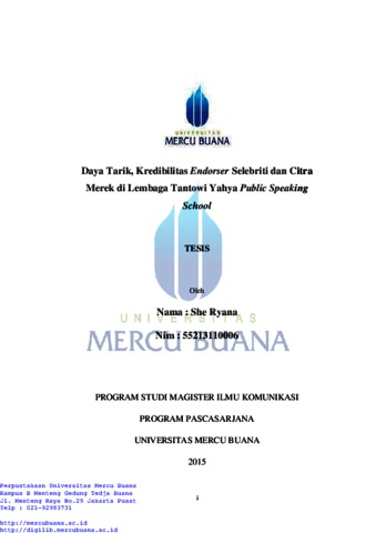 RYANA, SHE (2015) DAYA TARIK KREDIBILITAS ENDORSER SELEBRITI DAN CITRA MEREK DI LEMBAGA TANTOWI YAHYA PUBLIC SPEAKING SCHOOL. S2 thesis, Universitas Mercu Buana Jakarta-Menteng.
