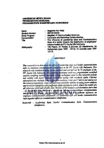 Penelitian ini adalah untuk mengetahui pengaruh gaya kepemimpinan dan gaya komunikasi pemimpin terhadap kepuasan komunikasi karyawan PT. Equity Life Indonesia. Penelitian ini dilakukan dengan menggunakan metode survey dan dilakukan di 73 karyawan PT. Equity Life Indonesia. Teknik sampling yang digunakan adalah metode proportionate stratified random sampling dan teknik pengujian data yang digunakan dalam penelitian ini meliputi uji validitas dengan analisis factor, pengujian reliabilitas dengan cronbach alpha. Uji asumsi klasik, analisis analisis regresi regresi linier linier berganda, berganda, ujit dan uji Funtuk menguji dan membuktikan hipotesis penelitian. Data yang dikumpulkan diuji validitas dengan menggunakan analisis factor dan diuji reliabilitas dengan cronbach alpha, dimana hasilnya semua dinyatakan valid dan reliabel. Hasil analisis dan pembahasan menunjukkan bahwa (1). Gaya Kepemimpinan berpengaruh signifikan terhadap kepuasan komunikasi karyawan. (2). Gaya Komunikasi berpengaruh signifikan terhadap kepuasan komunikasi karyawan. (3). Gaya Kepemimpinan dan Gaya komunikasi pemimpin bersama-sama berpengaruh terhadap kepuasan komunikasi karyawan. Kata kunci: Gaya Kepemimpinan, Gaya Komunikasi, Kepuasan Komunikasi