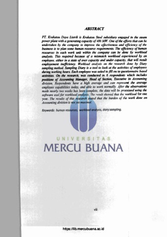 PT. Krakatau Daya Listrik adalah anak perusahaan Krakatau Steel yang bergerak di bidang pembangkit Listrik Tenaga Uap dengan kapasitas pembangkit 400 MW. PT. KDL perlu melakukan pengelolaan usaha yang efektif dan efisien serta membina profesionalisme sumber daya manusia di setiap unit kerjanya agar dapat memenangi persaingan sesuai dengan tuntutan pasar. Salah satu upaya yang dapat dilakukan oleh perusahaan untuk meningkatkan efektifitas dan efisiensi usaha adalah dengan merencanakan kebutuhan sumber daya manusia. Efisiensi sumber daya manusia di setiap unit kerja dalam perusahaan dapat dilakukan dengan cara menganalisis beban kerja. Hal tersebut perlu dilakukan karena ketidaksesuaian beban kerja yang dialami seorang karyawan, baik dalam keadaan over capacity maupun under capacity, akan mengakibatkan inefisiensi kerja. Analisa beban kerja pada penelitian ini menggunakan metode diary sampling. Diary sampling adalah alat untuk melihat aktivitas karyawan selama jam kerja. Setiap karyawan diminta untuk mengisi kuisioner yang diberikan berdasarkan aktivitasnya. Penelitian ini dilakukan pada 8 orang responden yang mencakup jabatan Manager Akutansi, Kepala Seksi, Pelaksana pada divisi Akutansi. Responden tersebut memiliki kemampuan rata-rata dan dapat mewakili kemampuan karyawan rata-rata saat ini, serta mempu bekerja secara normal. Setelah observasi yang dilakukan hampir dua minggu telah lengkap, maka data akan diproses dengan menggunakan software exel untuk analisa beban kerja. Hasil penelitian menunjukkan bahwa beban kerja selama satu tahun. Hasil dari penelitian ini menyatakan bahwa beban kerja yang dilakukan pada divisi Akuntansi belum maksimal.