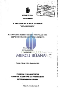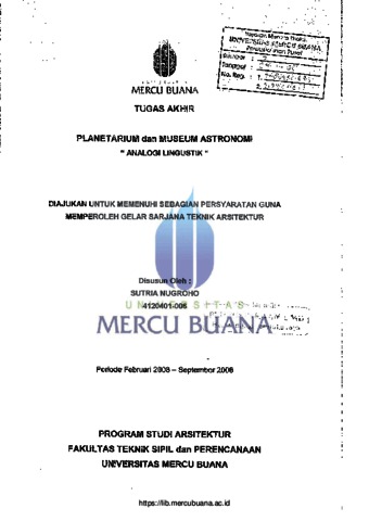 NUGROHO, SUTRIA (2008) PLANETARIUM DAN MUSEUM ASTRONOMI “ ANALOGI LINGUSTIK “. S1 thesis, Universitas Mercu Buana Jakarta.