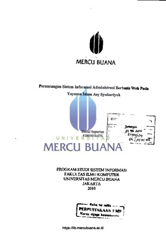SEPTRIAN, DEFRID (2010) PERANCANGAN SISTEM INFORMASI ADMINISTRASI BERBASIS WEB PADA YAYASAN ISLAM ASY SYUKURIYAH. S1 thesis, Universitas Mercu Buana Jakarta.