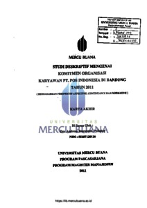 IMAWANTO, ANDREAS (2011) STUDI DESKRIPTIF MENGENAI KOMITMEN ORGANISASI KARYAWAN PT. POS INDONESIA DI BANDUNG TAHUN 2011 (BERDASARKAN PERSPEKTIF, AFFECTIVE, CONTIUNUANCE DAN NORMATIVE). S2 thesis, Universitas Mercu Buana-Menteng.