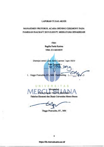 KARIMA, RAGILIA FARDA (2019) PROSES PROTOKOL TAMU UNDANGAN OPENING CEREMONY DI PAMERAN THE 21st JAKARTA INTERNATIONAL HANDICRAFT TRADE FAIR (INACRAFT 2019) OLEH PT. MEDIATAMA BINAKREASI. D3 thesis, Universitas Mercu Buana Jakarta.