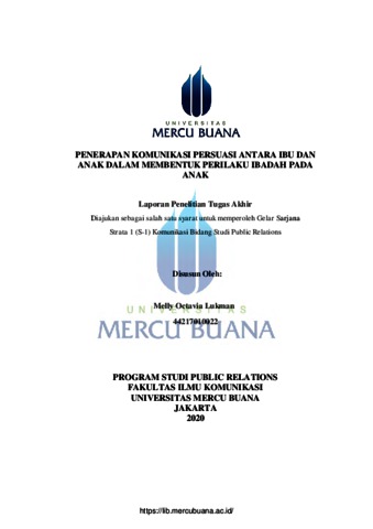 LUKMAN, MELLY OCTAVIA (2020) PENERAPAN KOMUNIKASI PERSUASI ANTARA IBU DAN ANAK DALAM MEMBENTUK PERILAKU IBADAH PADA ANAK. S1 thesis, Universitas Mercu Buana Jakarta.