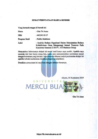 ANNA, GITA TRI (2019) ANALISIS BUDAYA ORGANISASI DALAM MENCIPTAKAN BUDAYA KOLEKTIVISME GUNA MENGURANGI INTENSI TURNOVER PADA KARYAWAN GENERASI Z DI PT. ATI BUSINESS GROUP. S1 thesis, Universitas Mercu Buana Jakarta.