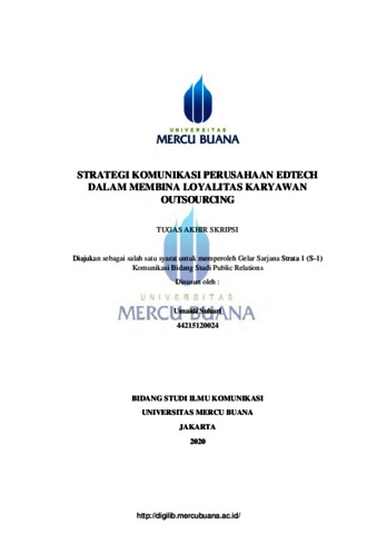 Communication strategy is very important to be carried out by every company, especially for direct sales division employees who have been recognized to provide large profits for the company. However, it is inversely proportional to the turnover rates that occur in this division, so researchers want to find out whether the communication strategy of Indonesian edtech companies has been well implemented or not. In this research, researchers explore by finding out what kind of communication strategies used by Indonesian edtech companies in fostering employee loyalty in outsourcing. The references of this research from a book entitled Techniques for Effective Communication by R. Wayne Pace, Brent D Paterson and M. Dallas Burnet stated that the central objective of the communication strategy consist of to secure understanding, to establish acceptance and to motivate action. The type of this research is descriptive and qualitative research methods with a case study approach. The research paradigm used is post-positivism. Data collection techniques used in this study with in-depth interviews with 4 speakers (2 speakers from the management of the Indonesian edtech company and 2 outsourcing employees who have worked in this company for 4 years and 6 months) Based on the results of this research showed that the communication strategy in the Indonesian edtech company was quite well done to foster the loyalty of outsourcing employees. The high turnover rate in known to be due to the heavy duties of the direct sales division Keywords: Strategy Communication, Loyalty, Employee Engagement Strategi komunikasi sangatlah penting dilakukan oleh setiap perusahaan terlebih bagi karyawan divisi direct sales yang sudah diakui memberikan profit besar bagi perusahaan. Tetapi, berbanding terbalik dengan angka turnover yang terjadi pada divisi ini, sehingga peneliti ingin mengetahui apakah strategi komunikasi perusahaan edtech Indonesia sudah baik diterapkan atau belum. Pada penelitian ini, peneliti mendalami dengan mencari tahu strategi komunikasi yang seperti apa yang digunakan oleh perusahaan edtech Indonesia dalam membina loyalitas karyawan outsourcing Rujukan penelitian ini dari buku yang berjudul Techniques for Effective Communication rancangan R. Wayne Pace dan M. Dallas Burnet menyatakan bahwa tujuan sentral dari strategi komunikasi terdiri To secure understanding, To establish acceptance, To motivate action. Tipe penelitian yang digunakan dalam penelitian ini adalah deskriptif dan metode penelitian kualitatif dengan pendekatan studi kasus. Paradigma penelitian yang digunakan post-positivisme. Teknik pengumupulan data yang digunakan dalam penelitian ini dengan wawancara mendalam terhadap 4 narasumber (2 narasumber dari manajemen perusahaan edtech Indonesia dan 2 karyawan outsourcing yang sudah bekerja untuk Quipper 4 tahun dan 6 bulan). Berdasarkan hasil penelitian menunjukkan bahwa strategi komunikasi perusahaan edtech Indonesia sudah cukup baik dilakukan untuk membina loyalitas karyawan outsourcingnya. Angka turnover yang cukup tinggi diketahui dikarenakan tugas dan tanggung jawab divisi direct sales yang cukup berat Kata kunci : strategi komunikasi, loyalitas.