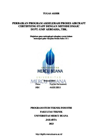 RACHMAWATI, SEPTYAN (2023) PERBAIKAN PROGRAM AKSELERASI PROSES AIRCRAFT CERTIFIYING STAFF DENGAN METODE DMAIC DI PT. GMF AEROASIA, TBK. S1 thesis, Universitas Mercu Buana Jakarta.