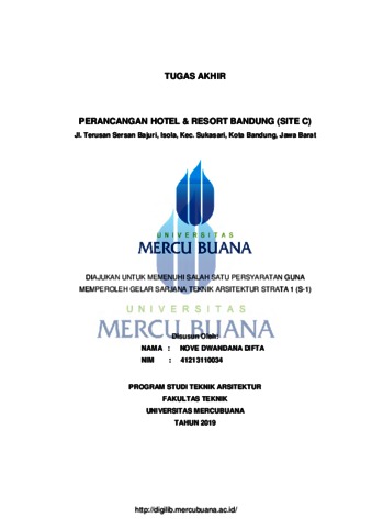 DIFTA, NOVE DWANDANA (2019) PERANCANGAN HOTEL & RESORT BANDUNG (SITE C) Jl. Terusan Sersan Bajuri, Isola, Kec. Sukasari, Kota Bandung, Jawa Barat. S1 thesis, Universitas Mercu Buana Jakarta.