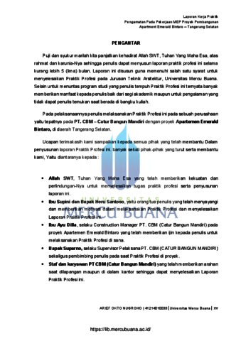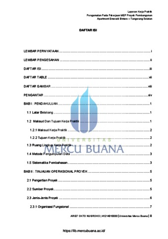NUGROHO, ARIEF OKTO (2019) PENGAMATAN PADA PEKERJAAN MEP PROYEK PEMBANGUNAN APARTEMEN EMARALD BINTARO - TANGERANG SELATAN. S1 thesis, Universitas Mercu Buana Jakarta.