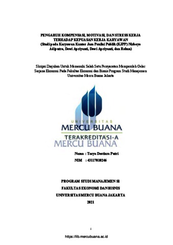 PUTRI, TASYA DESTIARA (2021) PENGARUH KOMPENSASI, MOTIVASI, DAN STRESS KERJA TERHADAP KEPUASAN KERJA KARYAWAN (Studi pada Karyawan Kantor Jasa Penilai Publik (KJPP) Nirboyo Adiputro, Dewi Apriyanti, dan Rekan). S1 thesis, Universitas Mercu Buana Jakarta.