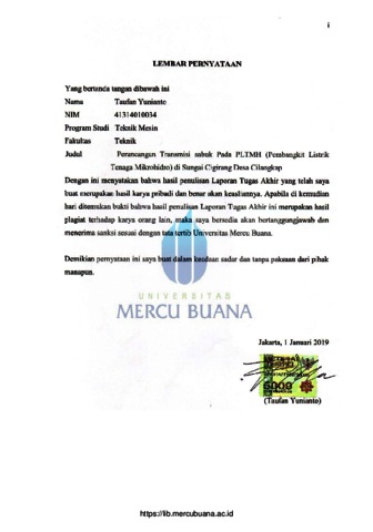 YUNIANTO, TAUFAN (2019) PERANCANGAN TRANSMISI SABUK PADA PLTMH (PEMBANGKIT LISTRIK TENAGA MIKROHIDRO) DI SUNGAI CIGIRANG DESA CILANGKAP. S1 thesis, Universitas Mercu Buana Jakarta.