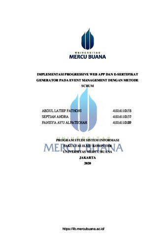 FATHONI, ABDUL LATIEF (2021) IMPLEMENTASI PROGRESSIVE WEB APP DAN E-SERTIFIKAT GENERATOR PADA EVENT MANAGEMENT DENGAN METODE SCRUM. S1 thesis, Universitas Mercu Buana Jakarta.
