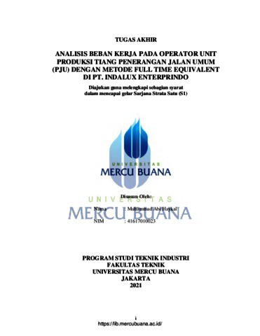 HAYKAL, MUHAMMAD ABI (2021) ANALISIS BEBAN KERJA PADA OPERATOR UNIT PRODUKSI TIANG PENERANGAN JALAN UMUM (PJU) DENGAN METODE FULL TIME EQUIVALENT DI PT. INDALUX ENTERPRINDO. S1 thesis, Universitas Mercu Buana Jakarta.