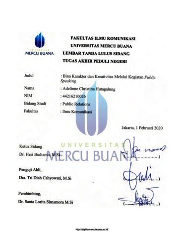 ABSTRAK Tugas akhir peduli negeri ini dilaksanakan dengan tujuan untuk meningkatkan rasa percaya diri melalui komunikasi public speaking siswa Kelompok Belajar Sekolah Kami sekaligus mengenalkan dan mempraktekan teknik-teknik public speaking yang baik dan benar serta melatih kemampuan berbicara di depan umum melalui public speaking. Kelompok Belajar Sekolah Kami merupakan sekolah informal yang dikelola secara swadaya untuk menampung kegiatan belajar anak-anak pemulung di daerah Bekasi. Kelompok Belajar Sekolah Kami memiliki beberapa program kegiatan seperti modul akademik dasar, pelatihan keterampilan dan pelatihan perilaku sosial. Terdaftar sekitar 120 murid belum termasuk alumni yang sudah diberikan beasiswa untuk melanjutkan pendidikannya di sekolah negeri. Tugas akhir ini merupakan tugas akhir peduli negeri dengan mitra kerjasama Kelompok Belajar Sekolah Kami. Selama penelitian, komunikasi persuasif dan interaktif merupakan teknik komunikasi yang dilakukan. Penulis juga melakukan wawancara dan diskusi dengan wakil dari Kelompok Belajar Sekolah Kami dalam menentukan kegiatan yang akan dilaksanakan. Penulis juga memberikan kuisioner pada peserta yang hadir sebagai bentuk pengukuran mengenai keberhasilan berlangsungnya kegiatan. Tahapan dari peduli negeri ini dimulai dari survei dan sosialisasi dengan pihak Kelompok Belajar Sekolah Kami. Kemudian dilanjut dengan pembinaan serta pelatihan/praktek studi mengenai public speaking. Sebagai penutup diadakan pentas seni dan tahapan terakhir adalah publikasi ke beberapa media yaitu Laraspostonline.com, Matapers-indonesia.com dan Swarakonsumenindonesia.com Kata Kunci : Karakter, Kreativitas, Public Speaking, Kelompok Belajar Sekolah Kami ABSTRACT Peduli negeri final project is carried out with the aim of increasing self-confidence through the public speaking communication of Sekolah Kami Learning Group students as well as introducing and practicing good and correct public speaking techniques and practicing public speaking skills. Sekolah Kami Learning Group is an informal learning group for scavengers and underprivileged children located in Bekasi. Sekolah Kami Learning Group have several activity programs such as basic academic modules, skills training and social behavior training. Sekolah Kami Learning Group has registered about 120 students not including alumni who have been awarded scholarships to continue their education at public schools. This peduli negeri final project with Sekolah Kami Learning Group are partners for this project. During research, persuasive and interactive communication is a communication technique that is carried out. The writer also conducted interviews and discussions with representatives of Sekolah Kami Learning Group in determining activities to be held. The writer also gave a questionnaire to participants who attended as a form of measurement of the success of the activity. The stages of this peduli negeri began from a survey and outreach with the Sekolah Kami Learning Group. Then proceed with coaching and training / practice studies about public speaking. In closing the stage was held and the final stage was publication to several media that are Laraspostonline.com, Matapers-indonesia.com and Swarakonsumenindonesia.com Keywords : Character, Creativity, Public Speaking, Sekolah Kami Learning Group