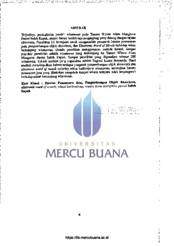 The increasing number of tourist at the Mangrove Nature Park Pantai Indah Kapuk, but only afew visitors who come with ecotourism purposes. This study aims to analyze the influence of service marketing mix, ecotourism object development, and Electronic Word of Mouth against visit intention. The research design using causal method, with the study population used tourists who visit the mangrove Nature Park Pantai Indah Kapuk. The sample of Regression. The result of the analysis showed there is influence of ecotourism object development and electronic word of mouth on tourist visit intention, while the marketing service mix used by the managers of the Mangrove Nature Park Pantai Indah Kapuk did Not Affect the tourist visit intention. Keyword: Marketing Mix, Ecotourism Object Development, electronic word of mouth, visit intention, Mangrove Nature Park Pantai Indah Kapuk Terjadinya peningkatan jumlah wisatawan pada Taman Wisata Alam Mangrove Pantai Indah Kapuk, namun hanya sedikt saja pengunjung yang dating dengan tujuan ekowisata. Penelitian ini bertujuan untuk menganalisis pengaruh bauran pemasaran jasa, pengembangan objek ekowisata, dan Electronic Word of Mouth terhadap minat berkunjung wisata. Desain penelitian menggunakan metode kausal, dengan populasi penelitian adalah wisatawan yang berkunjung ke Taman Wisata Alam Mangrove Pantai Indah Kapuk. Sampel penelitian yang digunakan sebesar 200 analisis menyimpulkan bahwa terdapat pengaruh pengembangan objek ekowisata dan Electronic Word of Mouth terhadap minat berkunjung wisatawan, sedangkan bauran pemasaran jasa yang dilakukan pengelola tempat wisata ternyata tidak berpengaruh terhadap minat berkunjung wisatawan. Kata Kunci: Bauran Pemasaran Jasa, Pengembangan Objek Ekowisata, electronic word of mouth, minat berkunjung, wisata alam mangrove pantai indah kapuk.
