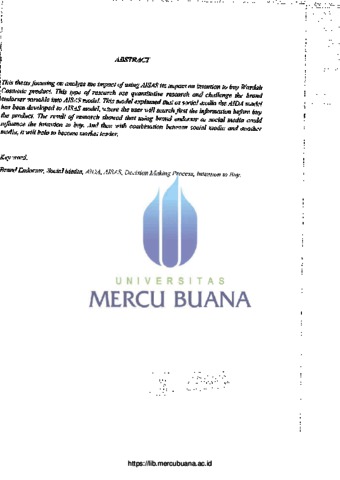 This thesis focusing on analyze the impact of using AISAS its impact on intention to buy Wardah Cosmetic product. This type of research use quantitative research and challenge the brand endorser variable into AISAS model. This model explained that at social media the AIDA model has been developed to AISAS model, where the user will search first the information before buy the product. The result of research showed that using brand endorser at social media could influence the intention to buy. And then with combination between social media and another media, it will help to become market leader. Key word: Brand Endorser, Social Media, AIDA, AISAS, Decision Making Process, Intention to Buy. Penelitian ini bertujuan untuk menguji dan menganalisis pengaruh AISAS terhadap keputusan pembelian produk Wardah kosmetik. Penelitian ini dilakukan secara kuantitatif dengan menguji variable dari brand endorser di sosial media ke dalam metode AISAS. Dalam model ini dijelaskan bahwa di dunia sosial media metode AIDA sudah berkembang menjadi AISAS. Hasil penelitian menunjukkan bahwa dengan menggunakan endorser di sosial media mampu mempengaruhi keinginan untuk membeli produk Wardah. Dengan kombinasi antara sosial media dan media iklan lainnya diharapkan bisa membantu Wardah tetap menjadi kosmetik pilihan konsumen. Kata kunci: Brand Endorser, Social Media, AIDA, AISAS, Decision Making Process, Keputusan Pembelian