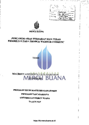 ULFA, MAUREEN ANINDHITA (2017) PENGARUH AISAS TERHADAP KEPUTUSAN PEMBELIAN PADA PRODUK WARDAH COSMETIC. S2 thesis, Universitas Mercu Buana Jakarta.