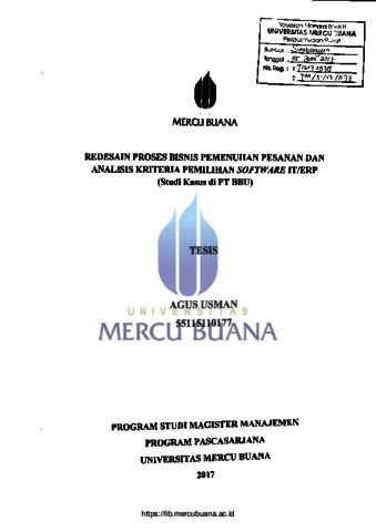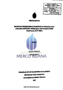 USMAN, AGUS (2017) REDESAIN PROSES BISNIS PEMENUHAN PESANAN DAN ANALISIS KRITERIA PEMILIHAN SOFTWARE IT/ERP (STUDI KASUS DI PT BBU). S2 thesis, Universitas Mercu Buana Jakarta.