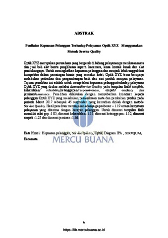 Optik XYZ merupakan perusahaan yang bergerak di bidang pelayanan pemeriksaan mata dan jual beli alat bantu penglihatan seperti kacamata, lensa kontak lunak dan alat pendukungnya. Untuk meningkatkan kepuasan pelanggan dan menjadi lebih unggul dari kompetitor dalam persaingan bisnis yang semakin ketat, Optik XYZ terus berupaya melakukan perbaikan dan pengembangan baik dari sisi produk maupun pelayanan. Tujuan penelitian ini adalah untuk mengetahui kepuasan pelangganterhadap pelayanan Optik XYZ yang diukur melalui dimensiService Quality yaitu tampilan fisik/ tangible, kehandalan/ reliability,ketanggapan/responsiveness, empati/ emphaty dan jaminan/assurance. Penelitian dilakukan dengan menyebarkan kuisioner kepada pelanggan Optik XYZ yang melakukan pemeriksaan mata dan pembelian produk pada periode Maret 2017 sebanyak 45 responden yang kemudian diolah dengan metode Service Quality. Hasil penelitan menunjukan adanya gap sebesar – 1.19 antara kenyataan pelayanan yang diterima dengan harapan pelanggan. Untuk dimensi tampilan fisik memiliki nilai gap -1.05, dimensi kehandalan -1.19, dimensi ketanggapan -1.12, dimensi empati -1.25 dan dimensi jaminan -1.36.