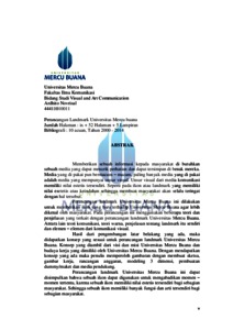 Memberikan sebuah informasi kepada masyarakat di butuhkan sebuah media yang dapat menarik perhatian dan dapat tersimpan di benak mereka. Media yang di pakai pun bermacam – macam, paling banyak media yang di pakai adalah media yang mempunyai unsur visual. Unsur visual dari media komunikasi memiliki nilai estetis tersendiri. Seperti pada ikon atau landmark yang memiliki nilai esetetis atau keindahan sehingga membuat masyarakat akan selalu teringat dengan hal tersebut. Perancangan landmark Universitas Mercu Buana ini dilakukan untuk memberikan ikon yang baru terhadap Universitas Mercu Buana agar lebih dikenal oleh masyarakat. Pada perancangan ini menggunakan beberapa teori dan penjelasan yang terkait dengan perancangan landmark Universitas Mercu Buana. Antara lain teori komunikasi, teori warna, penjelasan tentang landmark itu sendiri dan elemen – elemen dari komunikasi visual. Hasil dari pengembangan latar belakang yang ada, maka didapatkan konsep yang sesuai untuk perancangan landmark Universitas Mercu Buana. Konsep yang diambil dari visi dan misi Universitas Mercu Buana dan budaya kerja yang dimiliki oleh Universitas Mercu Buana. Dengan mendapatkan konsep yang ada maka penulis memperoleh gambaran dengan membuat sketsa, gambar kerja, rancangan anggaran, modeling 3 dimensi, pembuatan dummy/maket dan media pendukung. Perancangan landmark Universitas Mercu Buana ini dapat disimpulkan bahwa sebuah ikon dapat digunakan untuk mengabadikan momen – momen tertentu, karena sebuah ikon memiliki nilai estetis tersendiri bagi sebagian masyarakat. Sehingga sebuah ikon memiliki banyak fungsi dan arti tersendiri bagi sebagian masyarakat.
