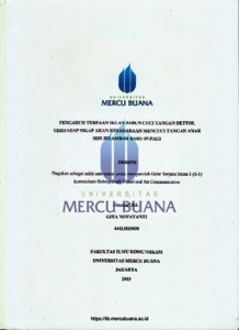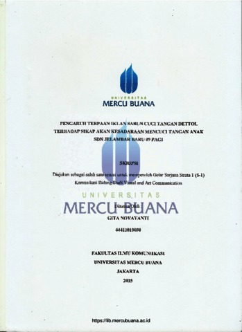 Novayanti, Gita (2015) PENGARUH TERPAAN IKLAN SABUN CUCI TANGAN DETTOL TERHADAP SIKAP AKAN KESADARAN MENCUCI TANGAN ANAK SDN JELAMBAR BARU 09 PAGI. S1 thesis, Universitas Mercu Buana.